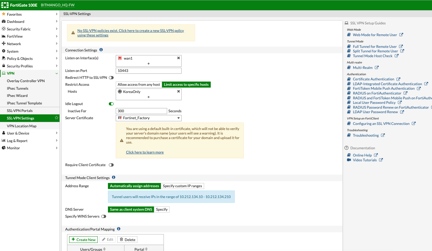 fortigate 100E의 SSL-VPN 설정 화면이다. 설정하기에 앞서 간략히 SSL-VPN에 대해 설명을 하자면