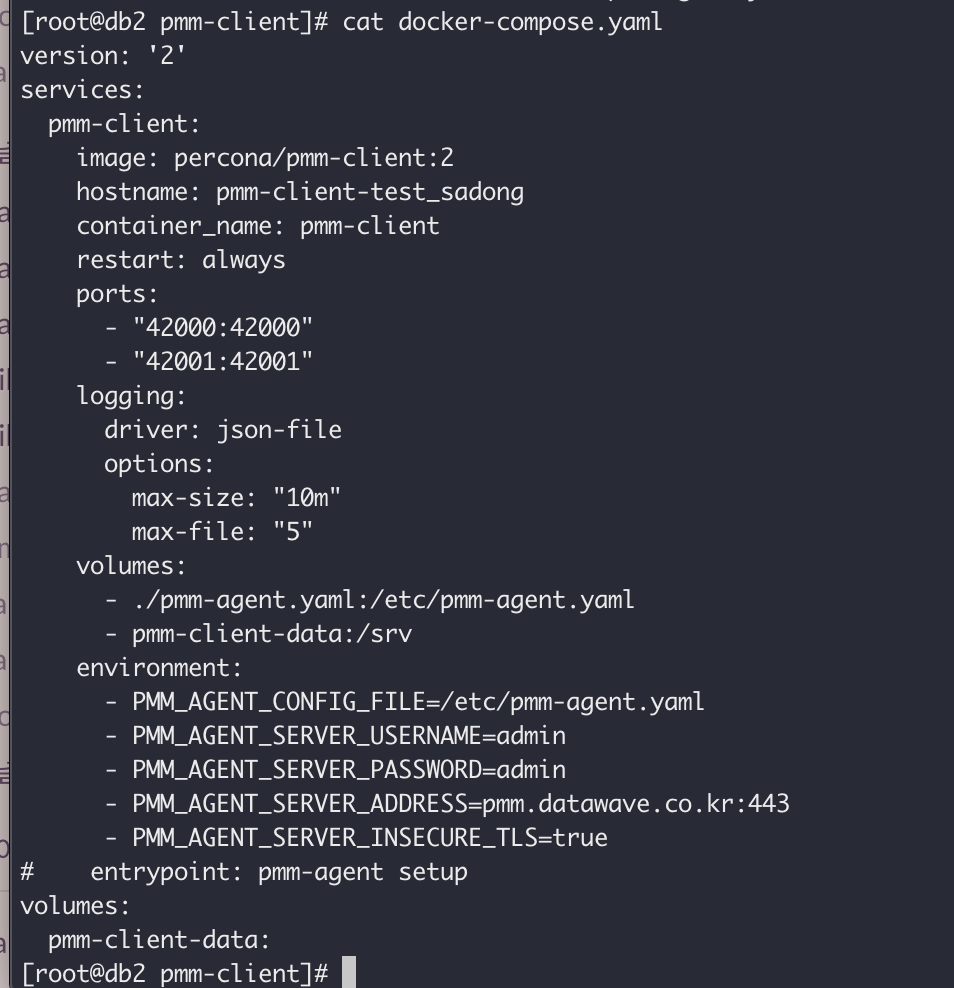 agent.yaml 생성 됐으면 마지막으로 다시한번 도커 컴포즈 야믈파일에서 entrypoint: pmm-agent setup 이부분 주석하고 다시한번 마지막으로 docker-compose up -d 으로 실행해주면 컨테이너가 잘 실행 될것이다.pmm-agent.yaml 파일에 데이터가 씌어져 있어야 한다.