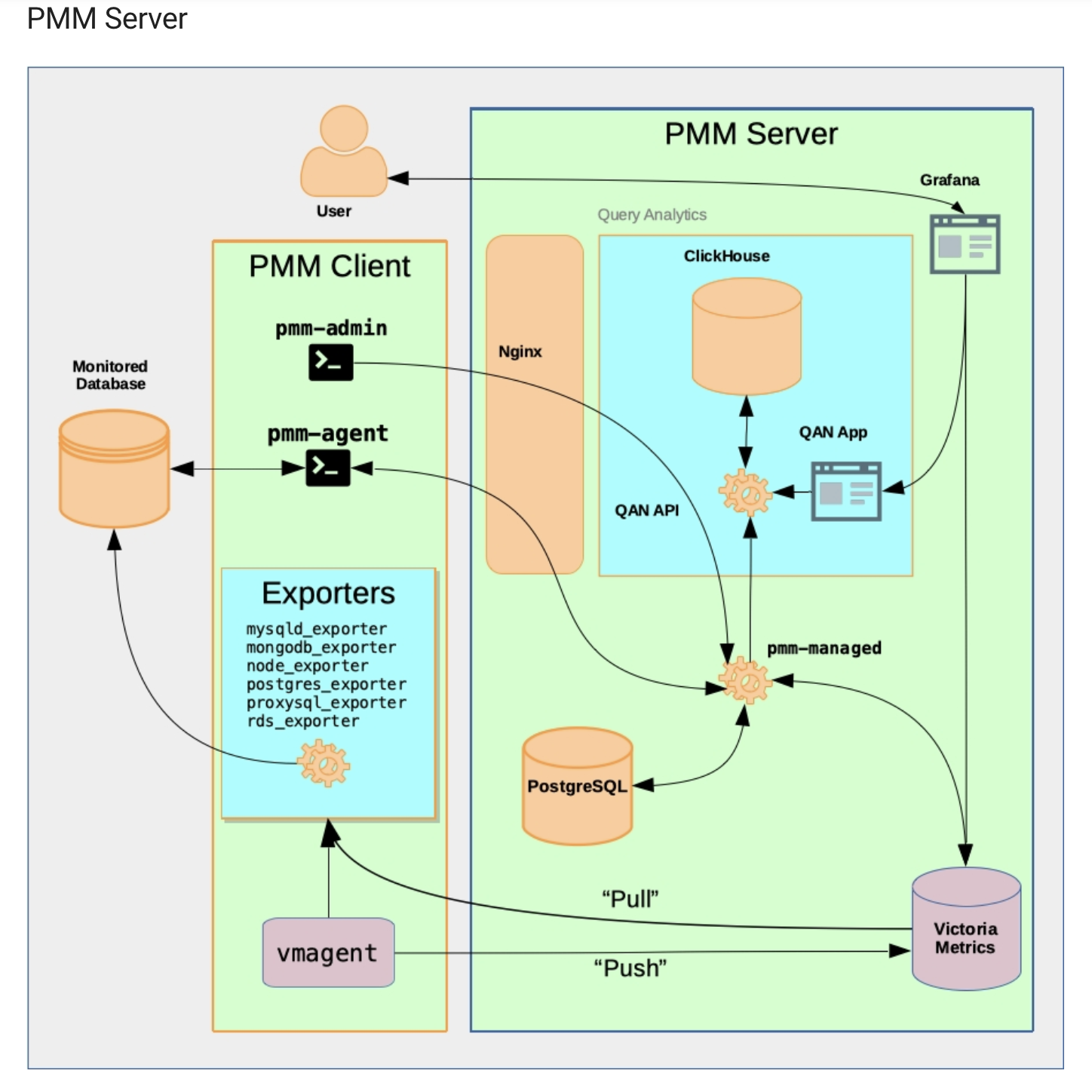 PMM 서버는 쿼리 분석을 위한 [QAN API, QAN web app] / DB저장 및 시각화하기 위한[그라파나, 프로메테우스, 클릭하우스]로 이루어져 있고 이것들로 유저는 PMM 서버의 엔진엑스/pgsql을 통해 웹 UI제공/설정저장이 가능하다.