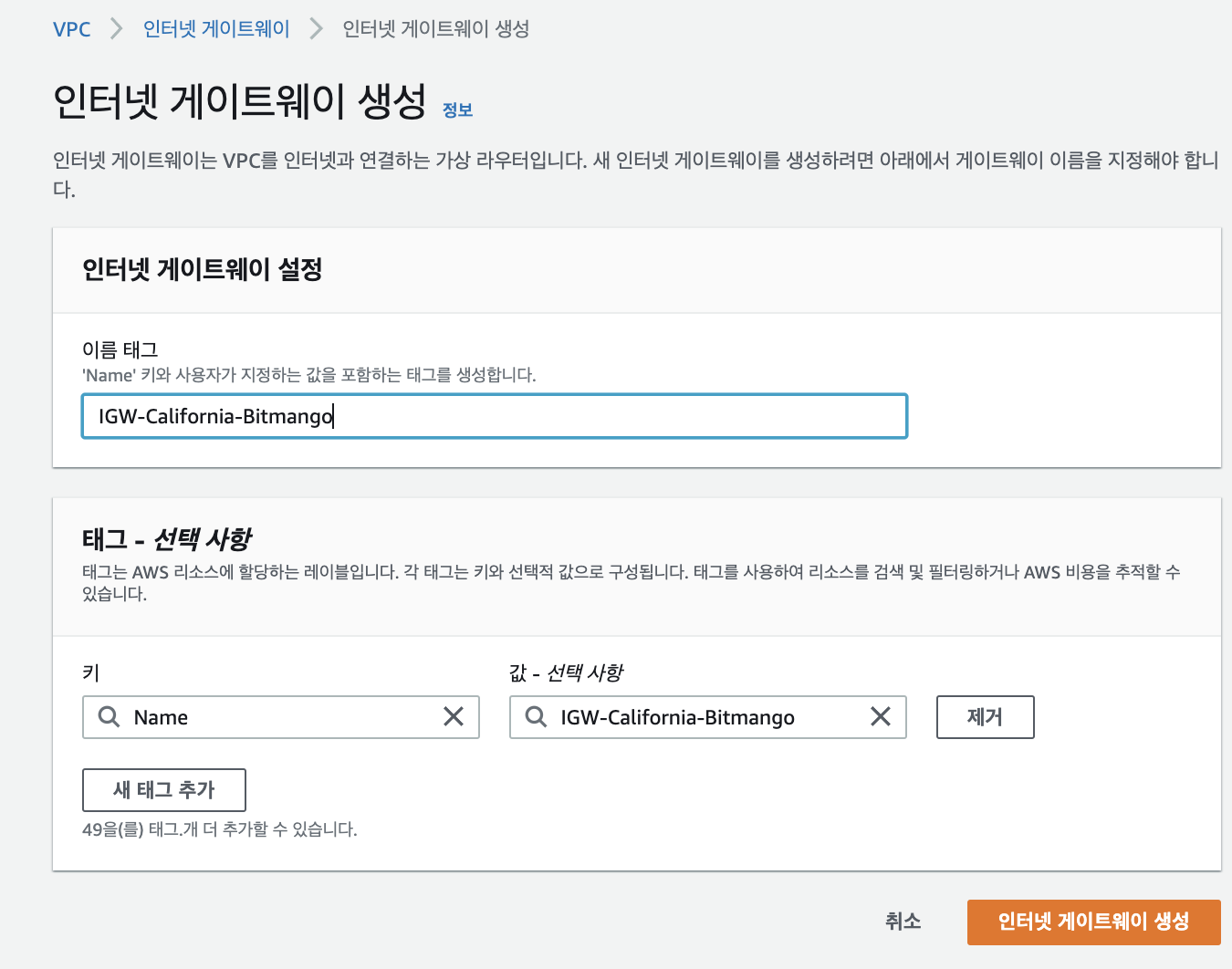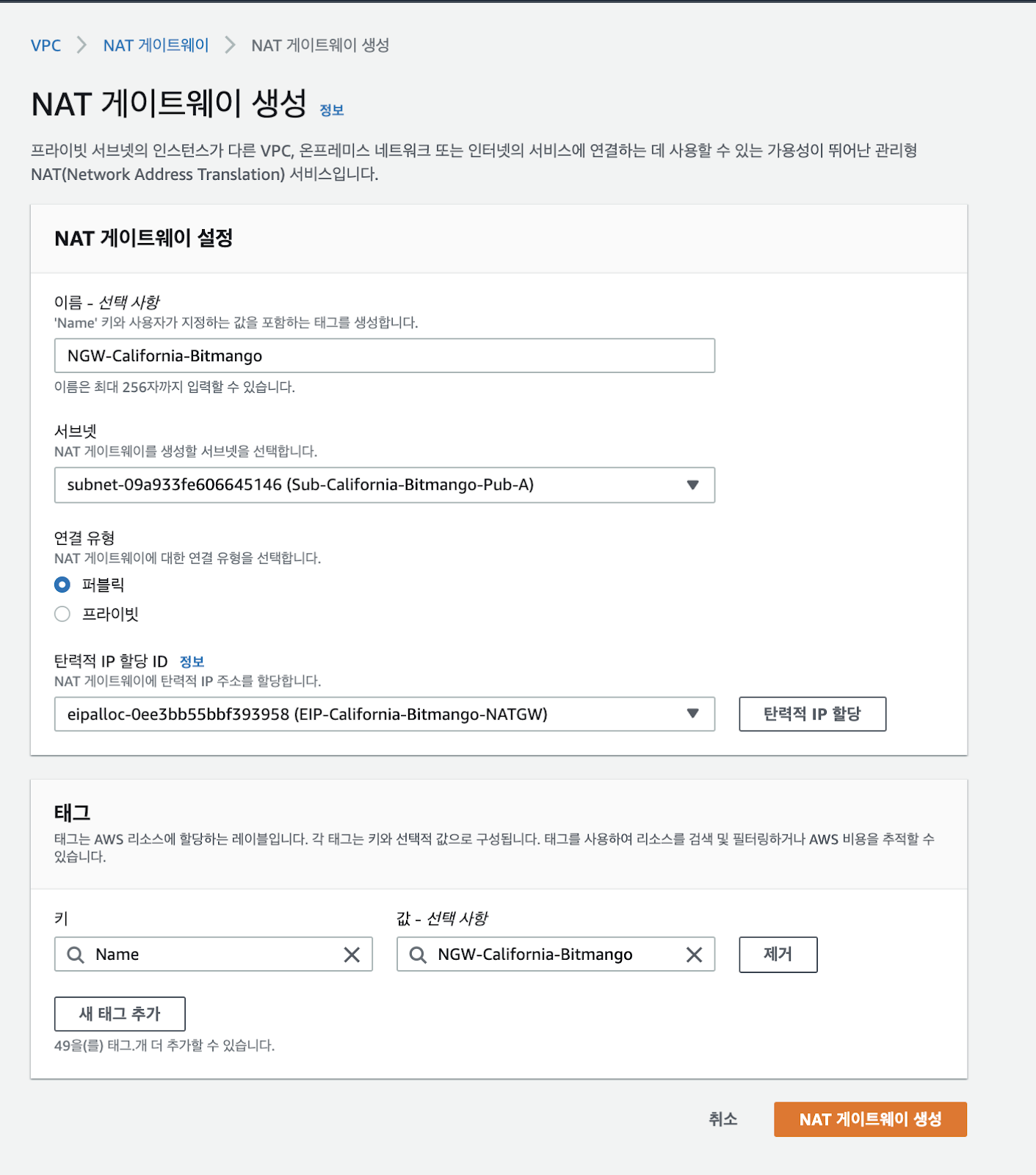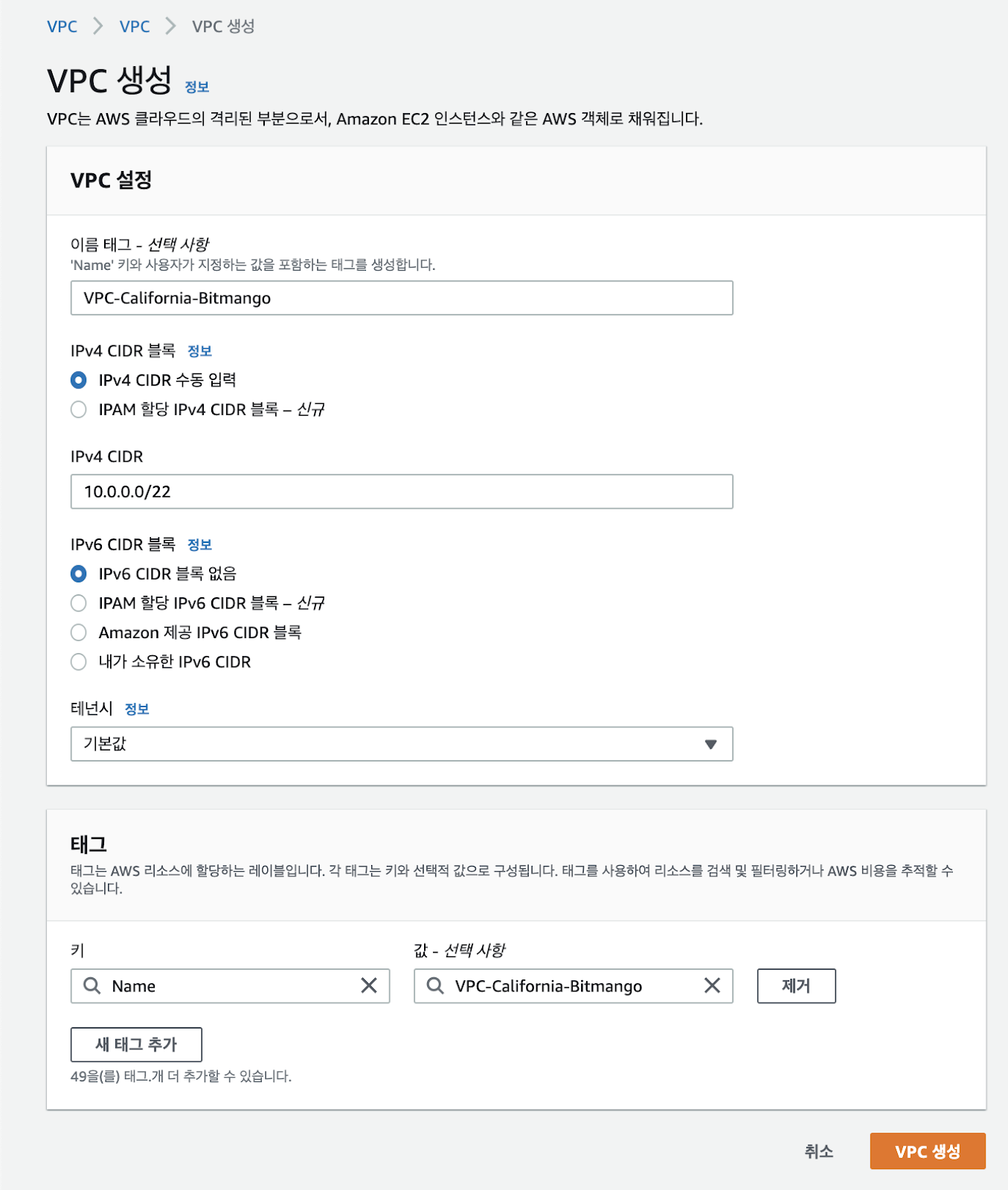 AWS-VPC&EC2 생성 메뉴얼 VPC(클라우드상에서 고객에게 지원되는 개인 사설 네트워크망)는 특별한경우(전혀 다른 용도의 AWS 네트워크 구성등)가 아니라면 리전별로 1개만 있으면 된다. 따라서 추가 EC2인스턴스 생성시 VPC 생성(1.AWS 네트워크 구성)은 건너뛰고 Public, Private, DB Netmask에 맞게끔 EC2를 할당