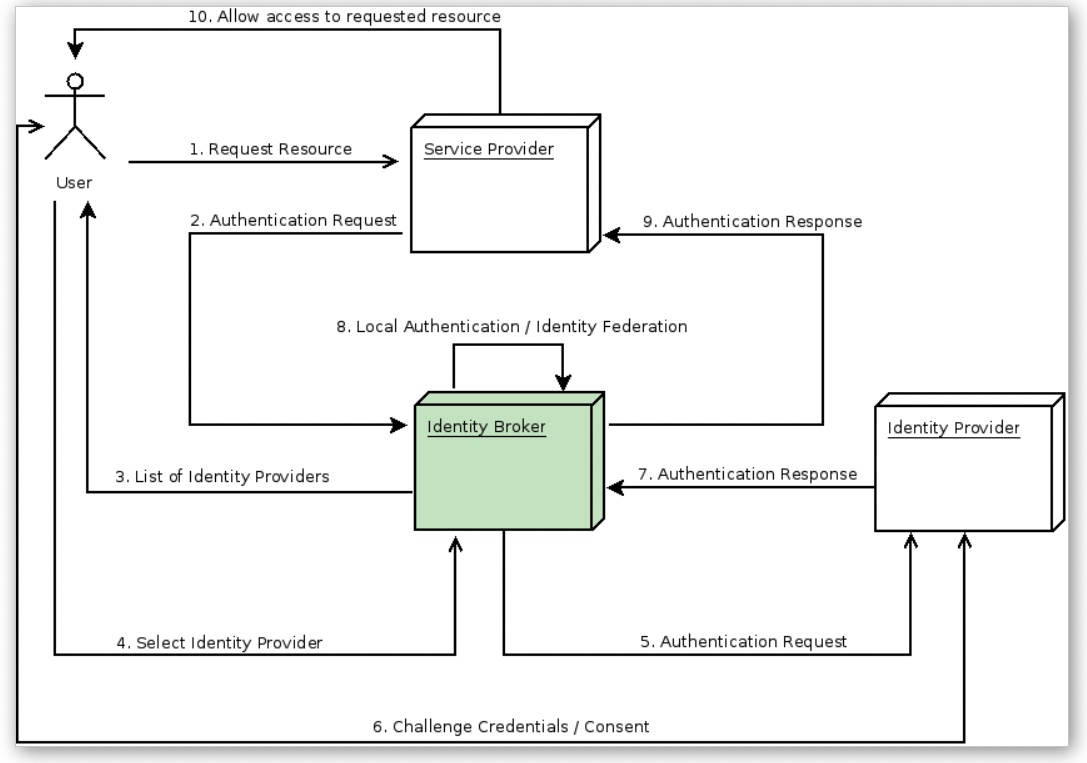 이 흐름의 변형이 가능합니다. 예를 들어, 클라이언트 애플리케이션에서 ID 공급자의 목록을 표시하지 않고 특정 공급자를 요청하거나, 사용자가 ID를 페더레이션하기 전에 추가 정보를 제공하도록 Keycloak을 설정할 수 있습니다.