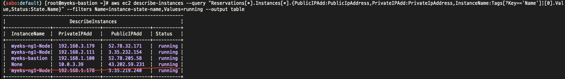 ssh -i **~/.ssh/kp-gasida.pem** ec2-user@$(aws cloudformation describe-stacks --stack-name **myeks** --query 'Stacks[*].Outputs[0].OutputValue' --output text)