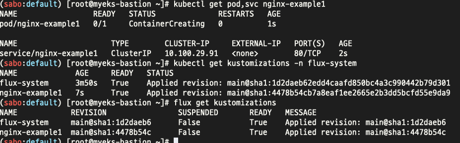 flux create **kustomization** **nginx-example1** --target-namespace=default --interval=1m --source=nginx-example1 --path="**./nginx**" --health-check-timeout=2m