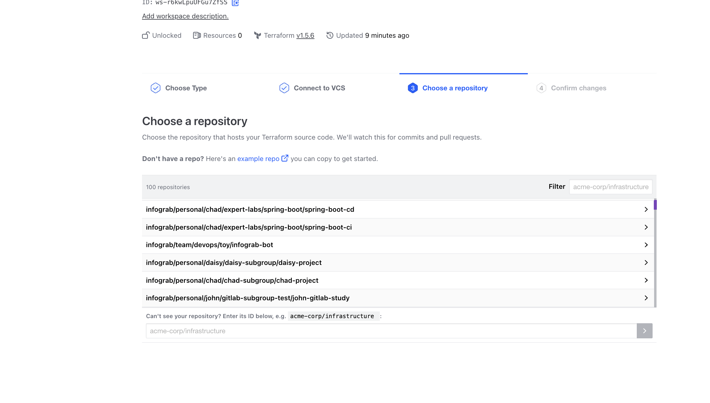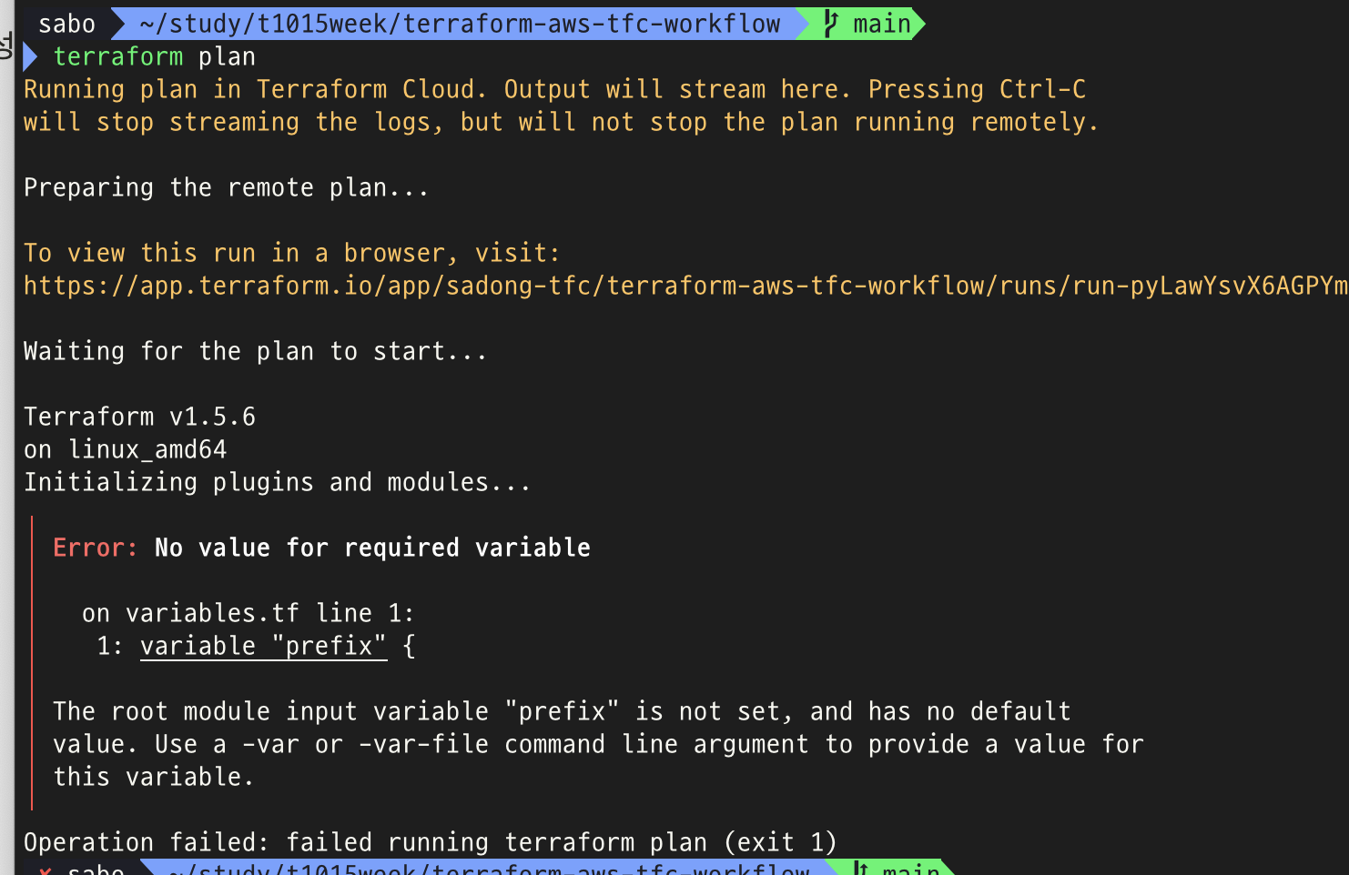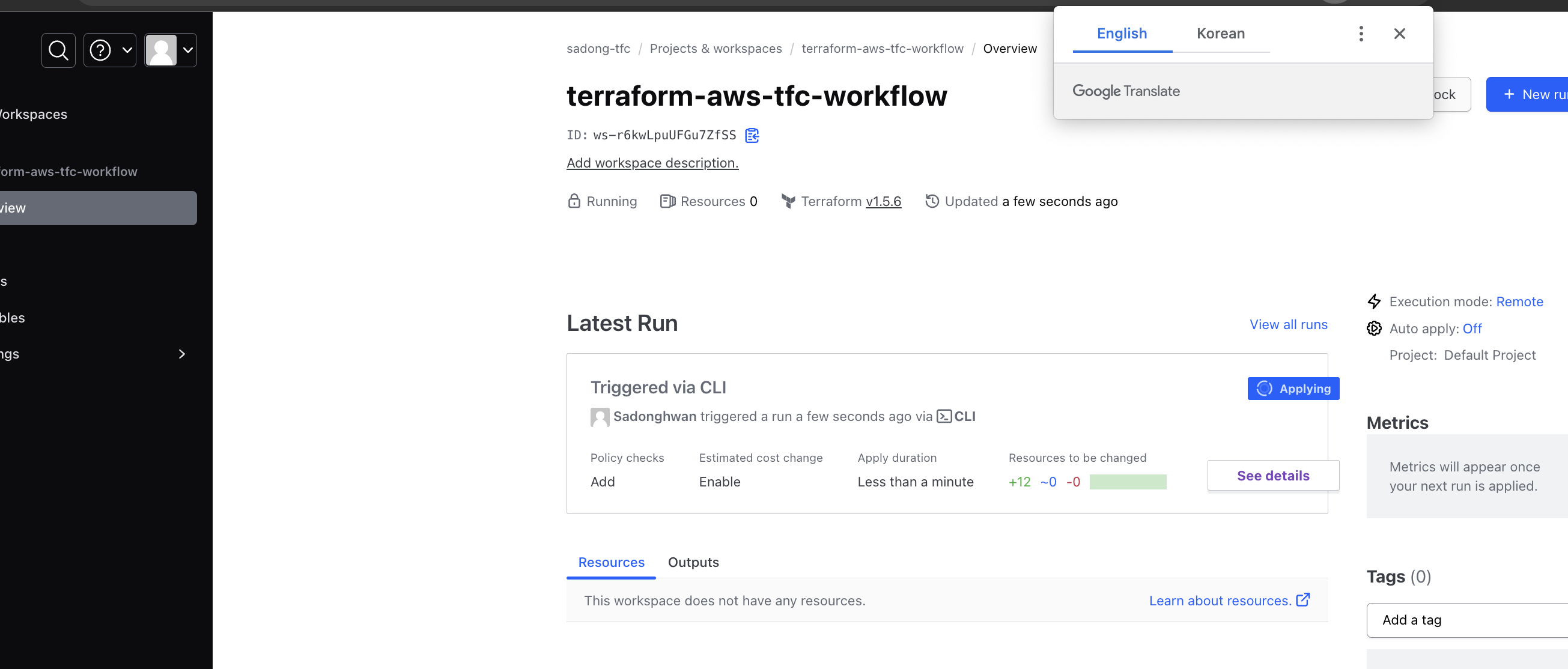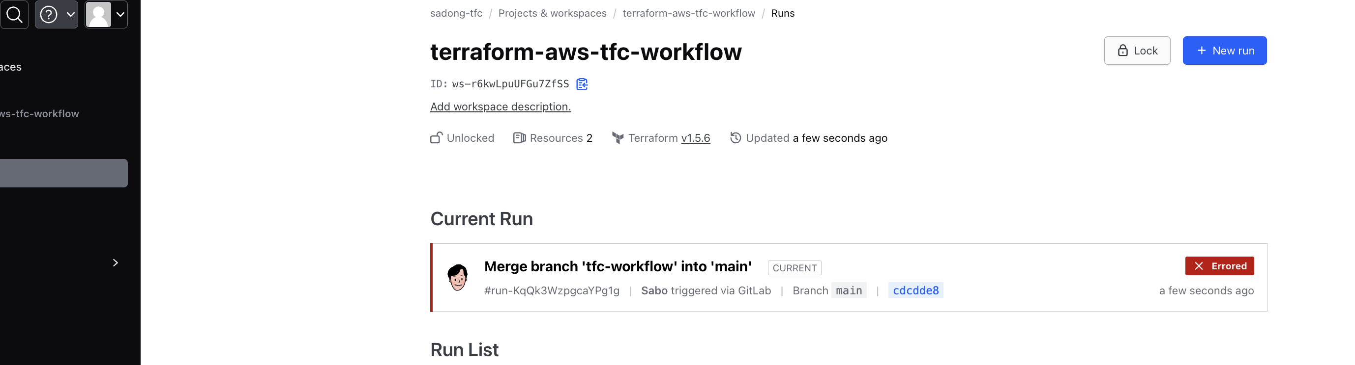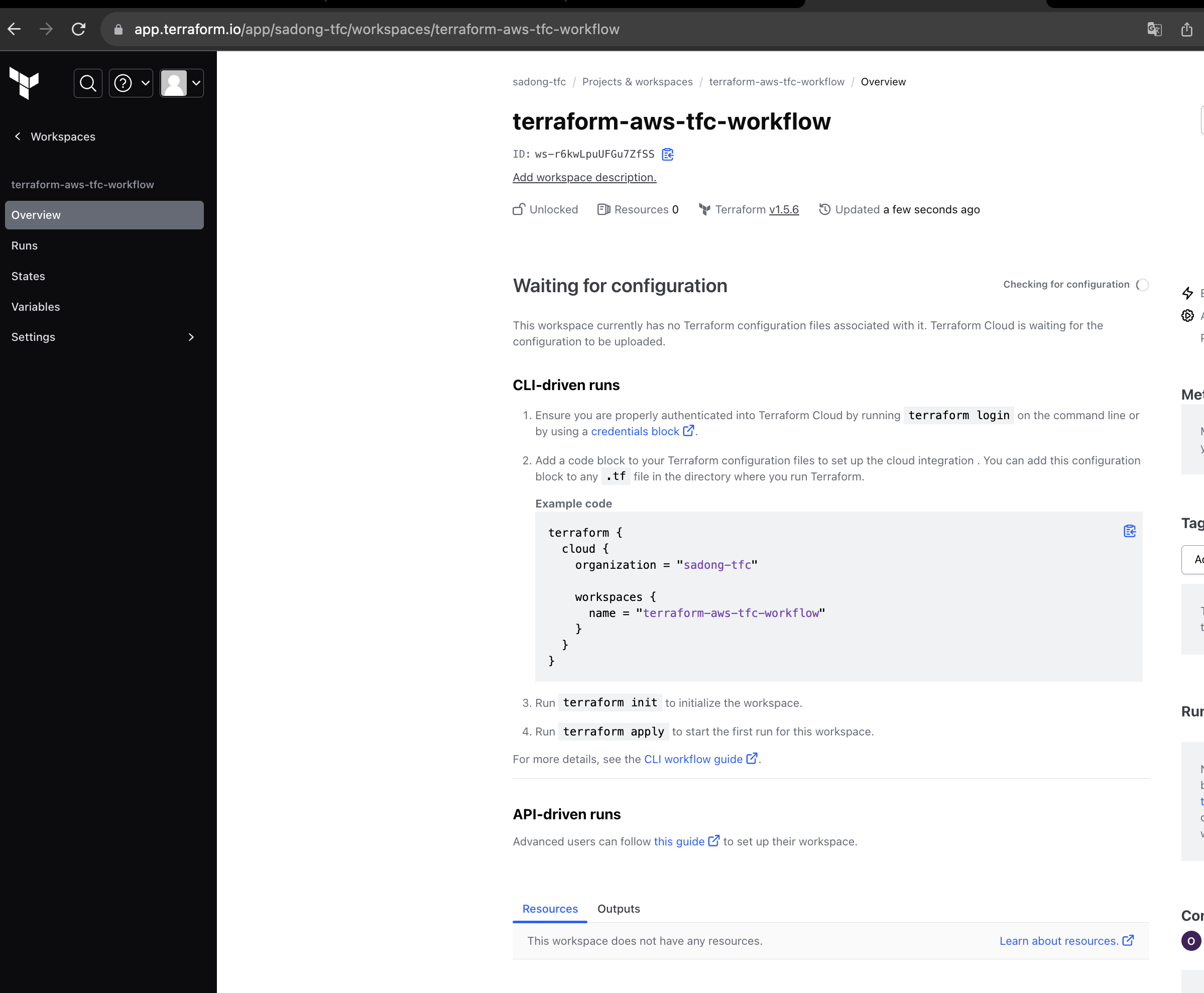 terraform-aws-tfc-workflow 워크스페이스가 생성된것이 확인된다.