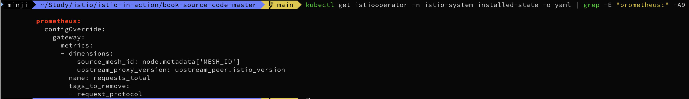 kubectl get istiooperator -n istio-system installed-state -o yaml | grep -E "prometheus:" -A9