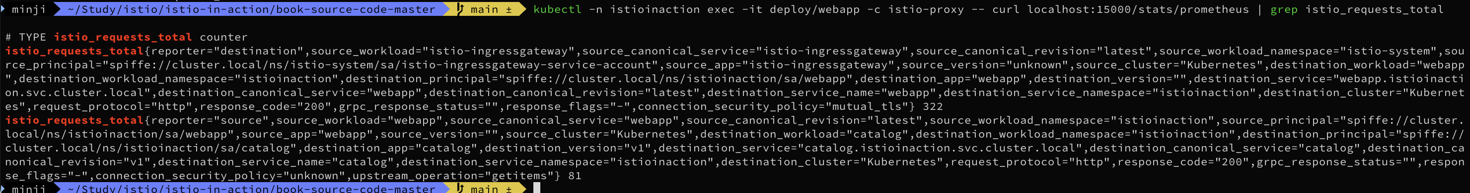 kubectl -n istioinaction exec -it deploy/webapp -c istio-proxy -- curl localhost:15000/stats/prometheus | grep istio_get_calls