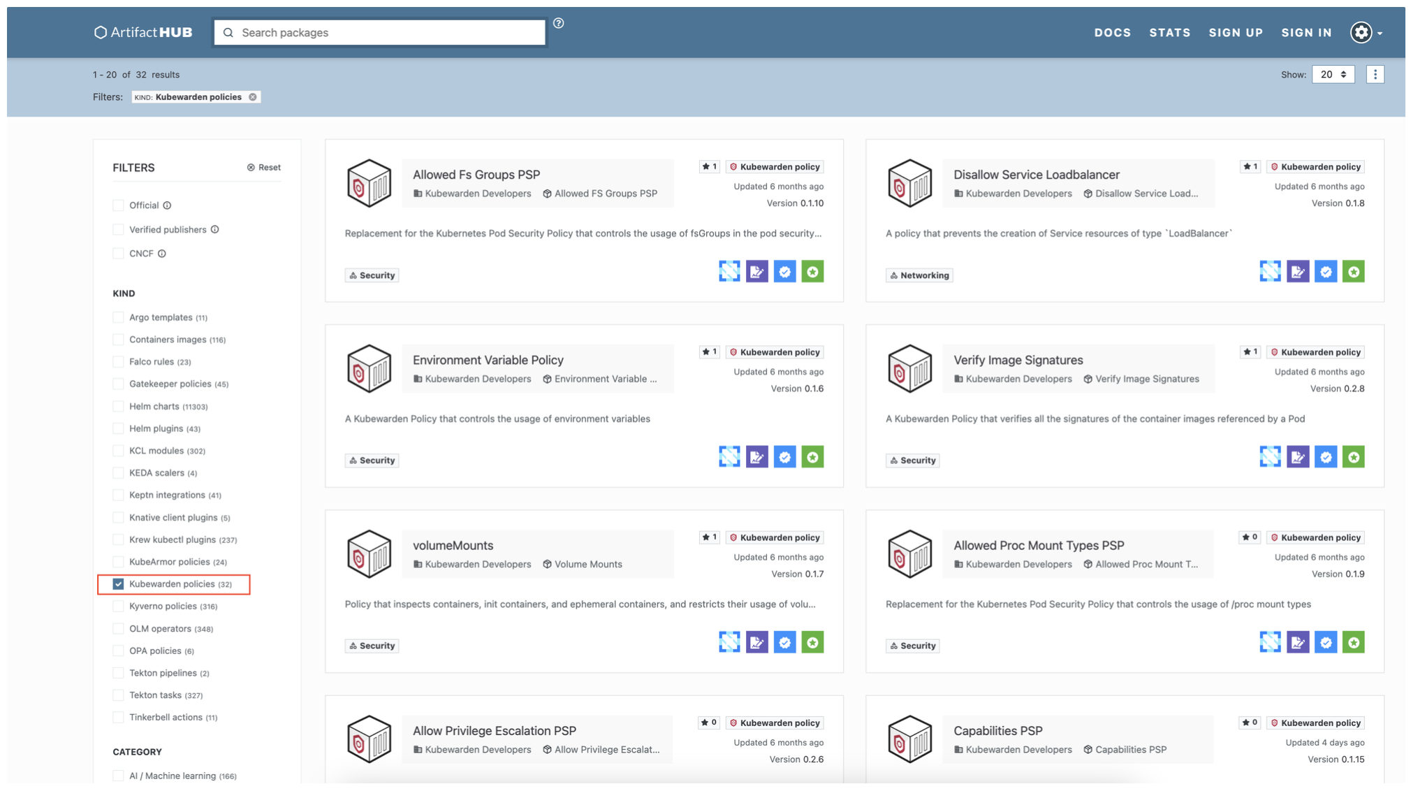 - Kubewarden 정책은 Artifact Hub에서 찾을 수 있으며, 이곳은 쿠버네티스 관련 거의 모든 것을 찾을 수 있는 장소입니다.