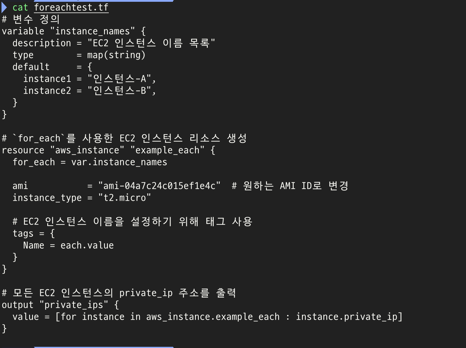 위 예제에서는 count를 사용하여 세 개의 EC2 인스턴스를 생성합니다. 각 인스턴스는 동일한 AMI 및 인스턴스 유형을 가지고 있습니다.