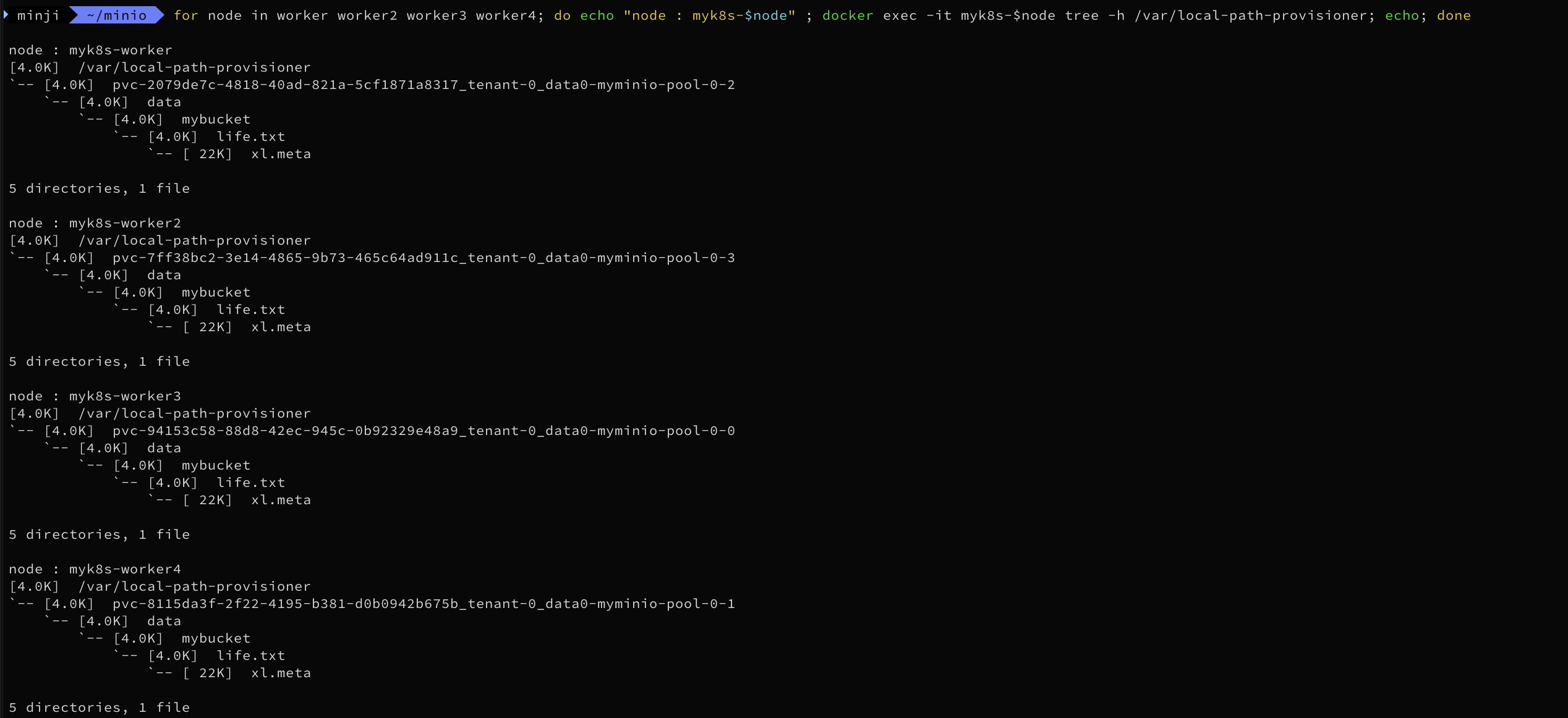 for node in worker worker2 worker3 worker4; do echo "node : myk8s-$node" ; docker exec -it myk8s-$node tree -h /var/local-path-provisioner; echo; done
