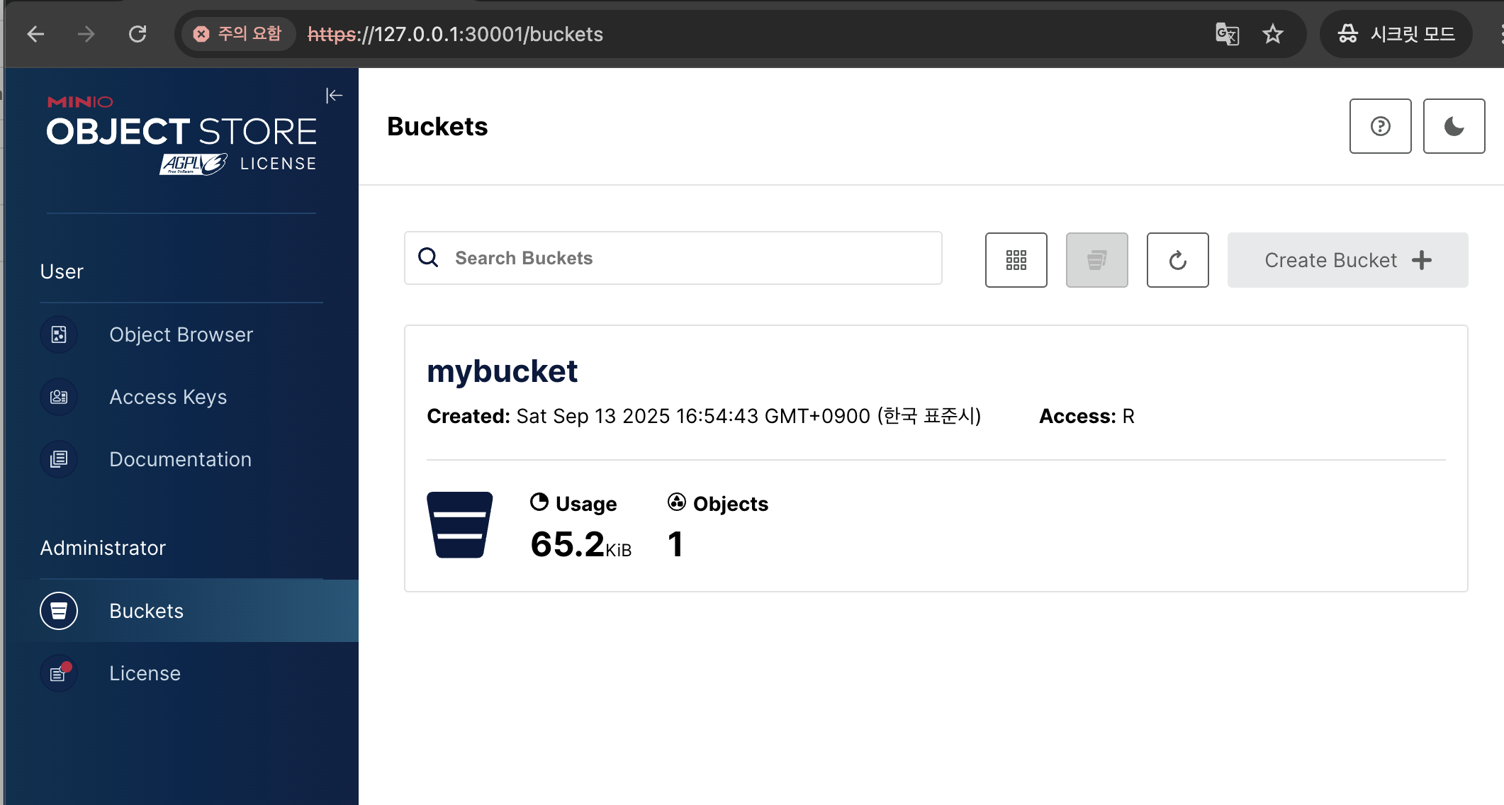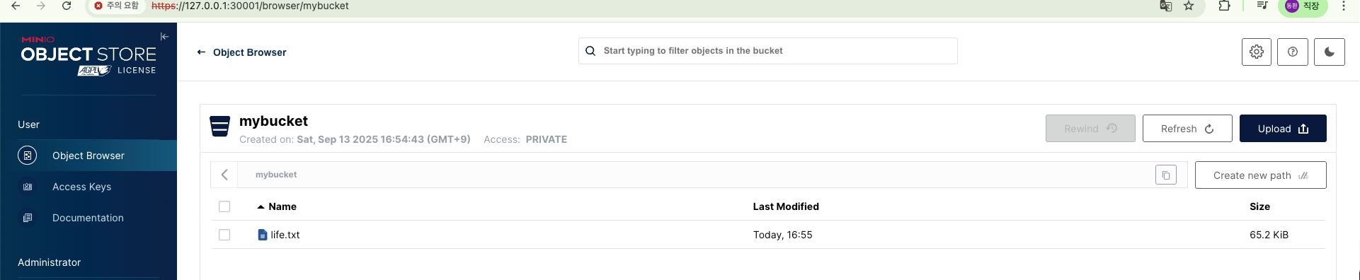 모든 S3 및 MinIO 관리 API 요청(PUT,GET,DELETE등)은 유효한 키가 있어야만 접근할 수 있습니다.