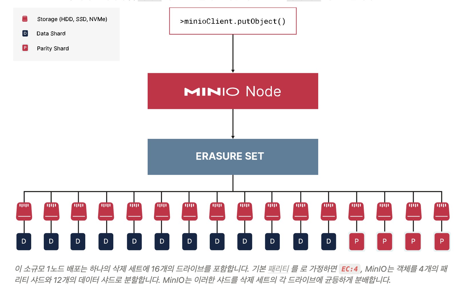Erasure Coding (MinIO): 객체 단위로 데이터/패리티 블록을 나누어 여러 노드, 드라이브에 분산 저장. 실패 시, 객체 단위로 빠르게 복구 가능. Bitrot(사일런트 데이터 손상)까지 검출/치유 지원하여, SAN/NAS snapshotting 접근 방식보다 훨씬 효율적.