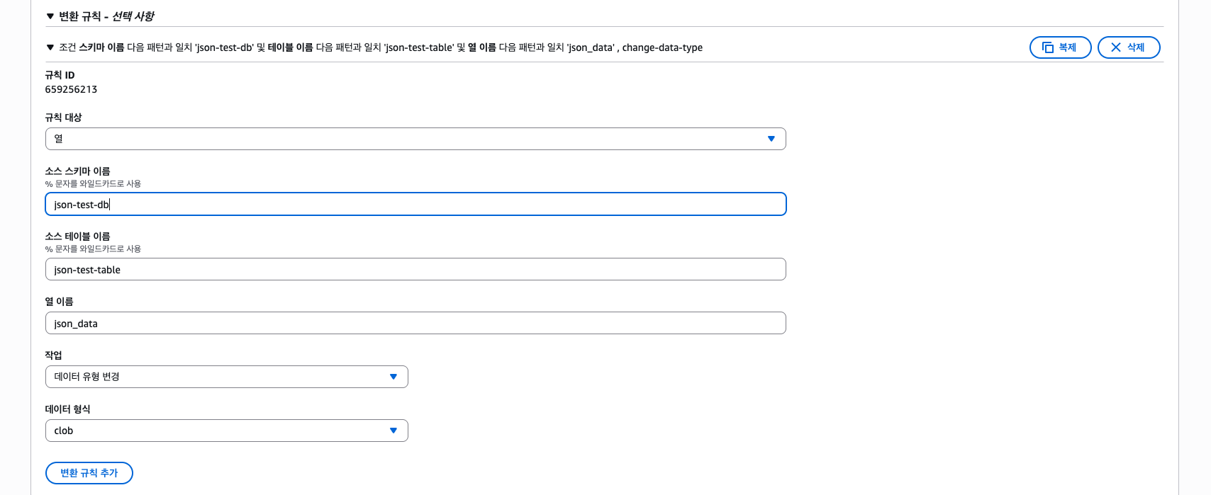 위와 같이 문제 발생하는 테스크(소스 디비에 컬럼 데이터 타입이 JSON이 들어가 있는 테스크)를 변환 규칙으로 기존 data type이 json인걸 찾아서 이를 clob으로 데이터 유형을 변경해주면 해결된다.