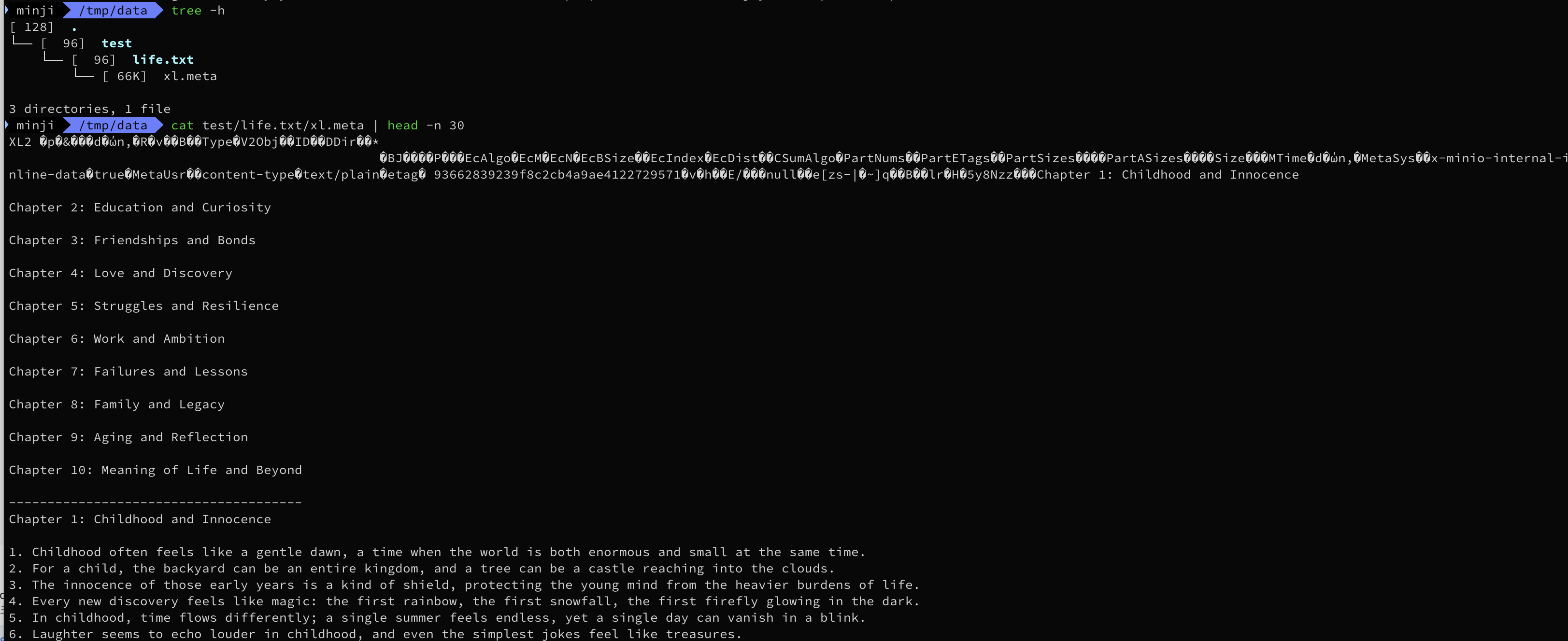 kubectl exec -it -n tenant-0 sts/myminio-pool-0 -c minio -- cat /export/data/mybucket/life.txt/xl.meta