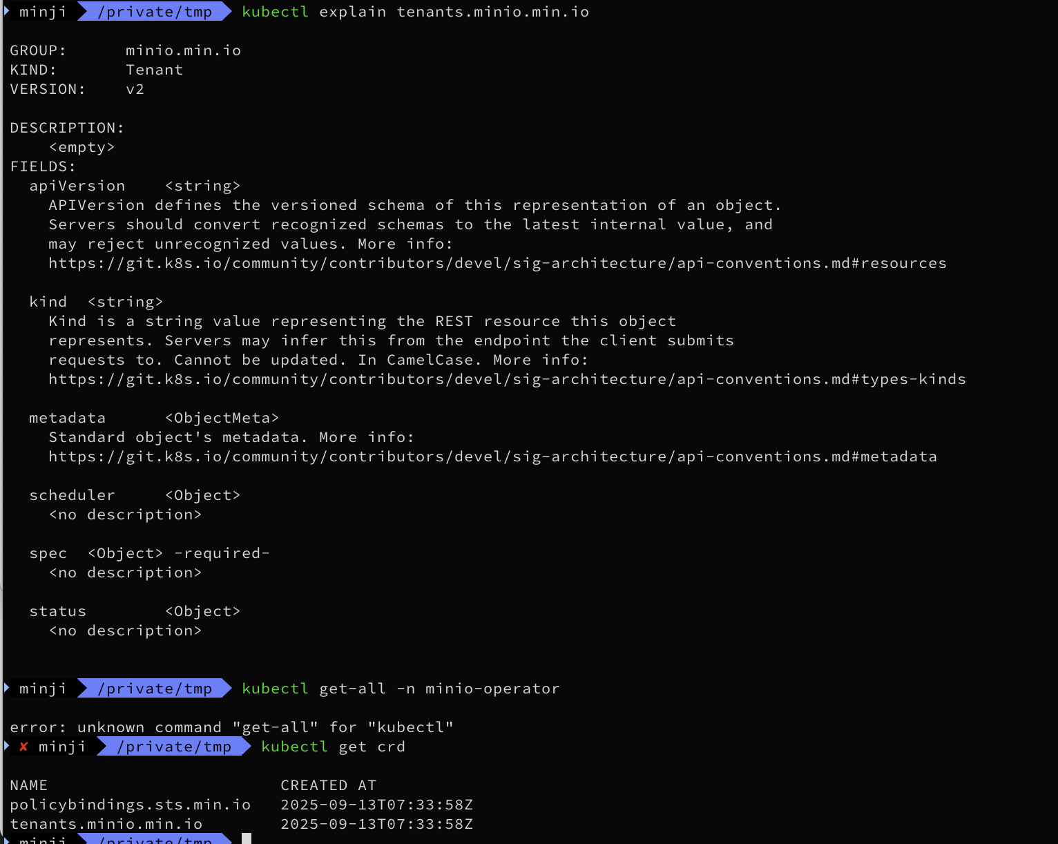 export MINIO_SERVER_URL="https://minio.tenant-0.svc.cluster.local:443"