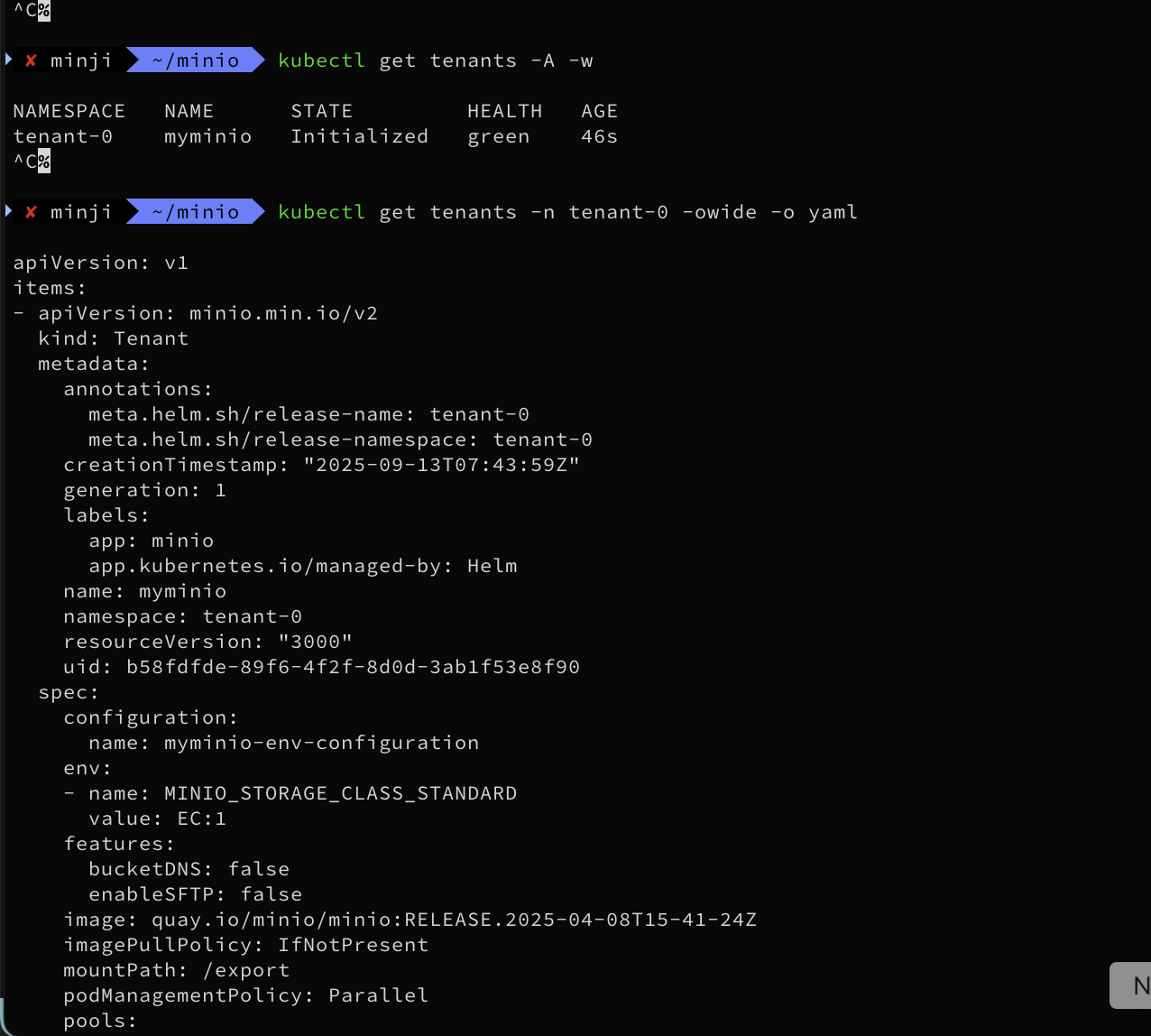 kubectl exec -it -n tenant-0 sts/myminio-pool-0 -c minio -- env