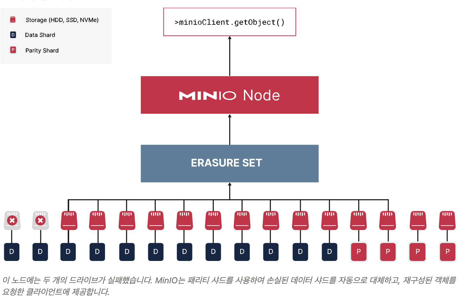 RAID: 블록 단위 복제 또는 패리티, 복구시 전체 드라이브를 rebuild해야 함. 디스크 용량 커질수록 복구 시간/리스크 증가, 대규모 환경에 비효율적.