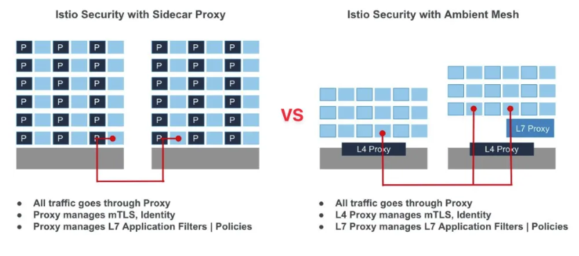 Istio Ambient Mesh는 사이드카 프록시 없이 인프라에 통합된 데이터플레인 방식을 제공한다. 기존 Istio는 각 파드마다 사이드카 프록시를 배치하여 트래픽을 제어했다.