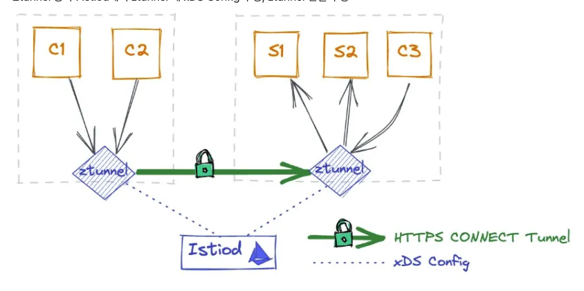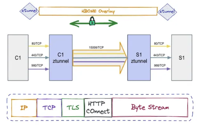 HBONE(HTTP Based Overlay Network Encapsulation) 프로토콜을 활용해 HTTP CONNECT 방식으로 트래픽을 터널링한다. HTTP/2와 mTLS를 사용하여 암호화 및 상호 인증을 제공한다.