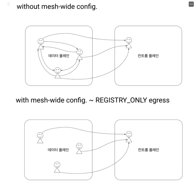 **Sidecar 리소스**를 사용해 트래픽 송신을 istio-system 및 prometheus 네임스페이스의 서비스로만 제한한다. 이를 통해 프록시에 전달되는 엔보이 설정 크기가 현저히 줄어들어 컨트롤 플레인 부하가 감소한다. 설정 최소화로 CPU/메모리 사용량과 네트워크 대역폭이 절약되며, 서비스 간 명시적 의존성 정의가 강제되어 운영 안정성이 향상된다.