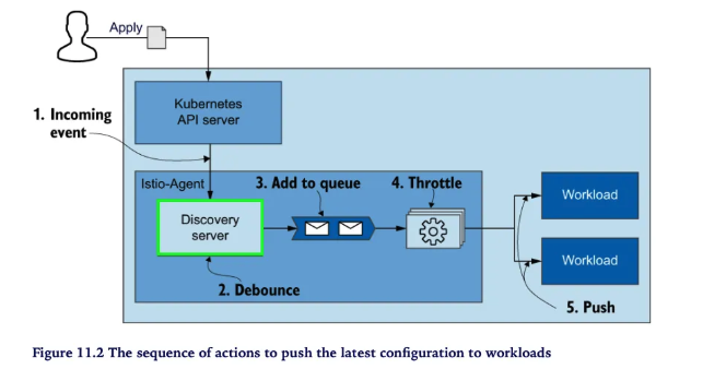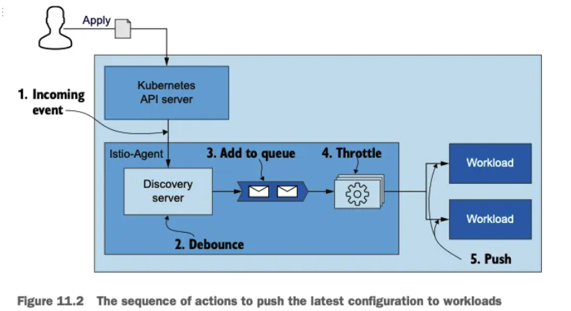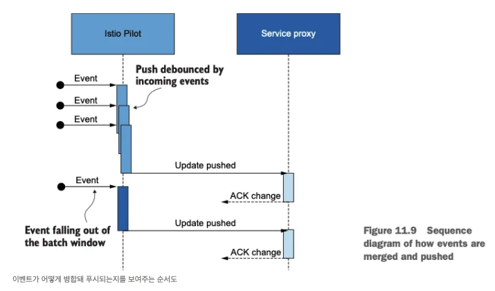 이스티오 컨트롤 플레인은 이벤트를 일정 시간(PILOT_DEBOUNCE_AFTER) 동안 모아 병합해 디바운싱을 수행한다. 이를 통해 중복 이벤트를 제거하고 단일 설정 업데이트로 변환해 푸시 횟수를 줄인다. PILOT_PUSH_THROTTLE로 동시 처리 가능한 푸시 요청 수를 제한해 CPU 자원 낭비를 방지한다.
