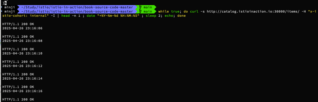 # 5초 후(baseEjectionTime: 5s) 다시 엔드포인트 모니터링