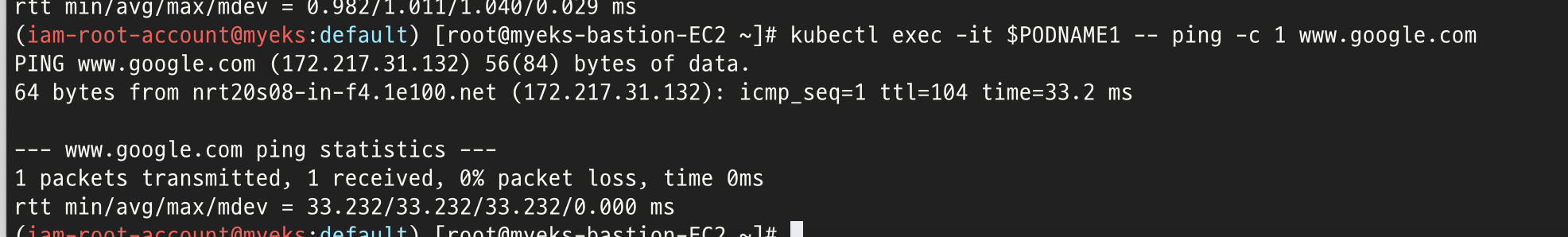 # eksctl-host 에서 노드의IP나 coredns 파드IP로 ping 테스트