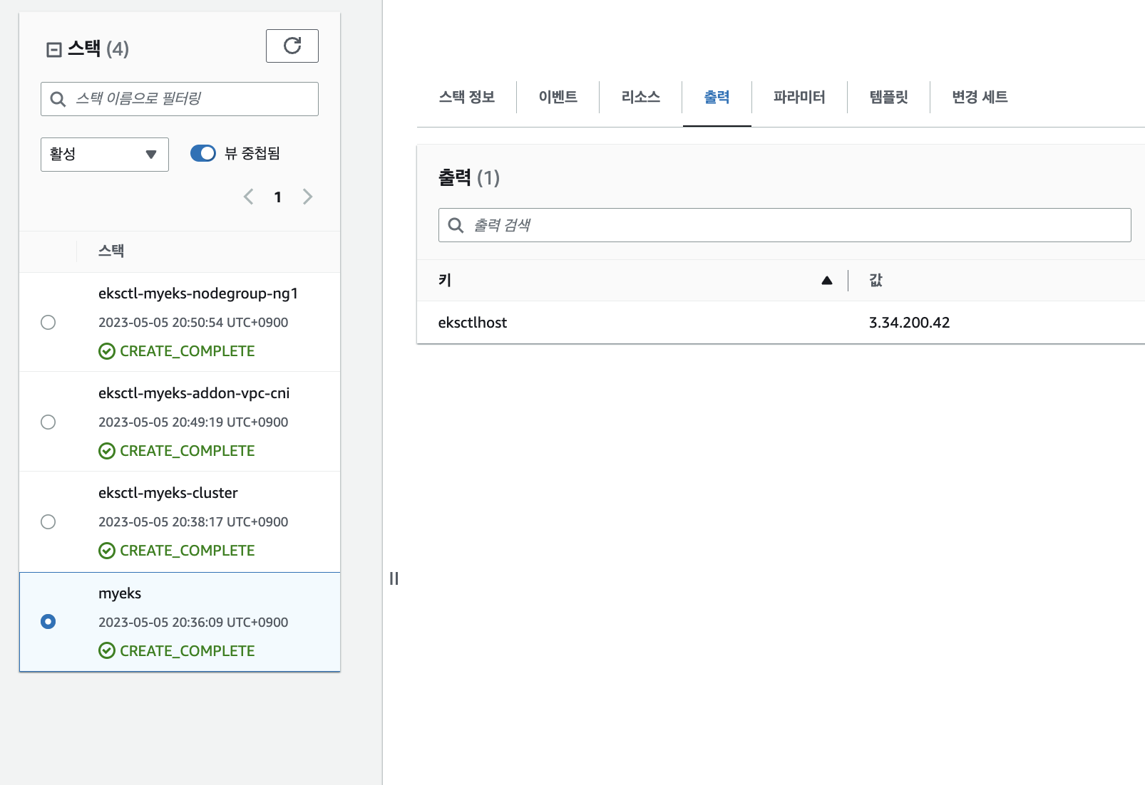aws cloudformation describe-stacks --stack-name **myeks** --query 'Stacks[*].**Outputs[0]**.OutputValue' --output text