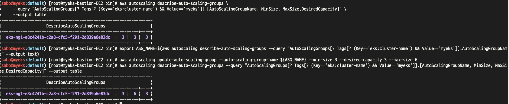 ssh -i **~/.ssh/kp-gasida.pem** ec2-user@$(aws cloudformation describe-stacks --stack-name **myeks** --query 'Stacks[*].Outputs[0].OutputValue' --output text)